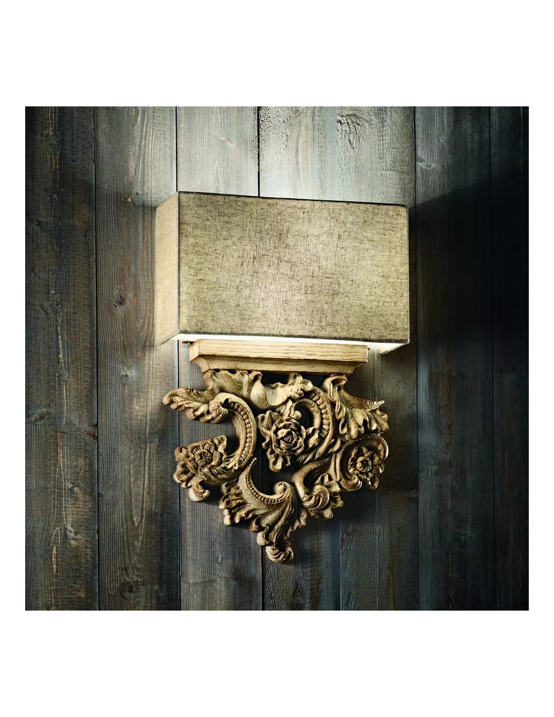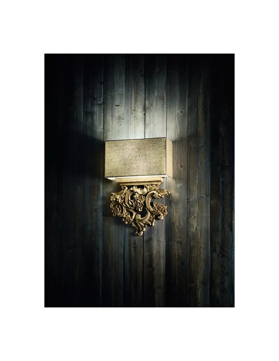 L’applique Peter Ideal Lux est une fidèle reproduction des appliques anciennes. Base en résine façonnée à la main comme une reproduction fidèle du bois sculpté. Abat-jour en lame de PVC recouvert de tissu façon lin.