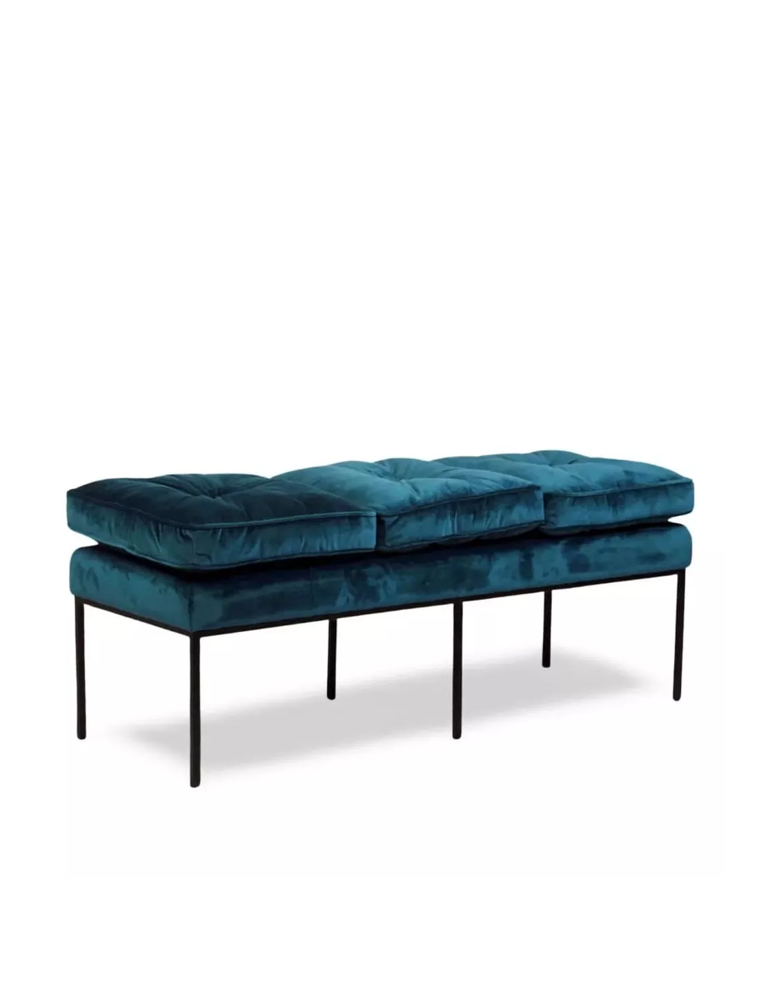 Cette banquette bleu en velours est un joli mélange de matières. Elle est conçue en acier de couleur noire et d’une assise garnie de mousse polyuréthane pour une assise moelleuse et confortable, recouvert d’un velours de couleur bleu.