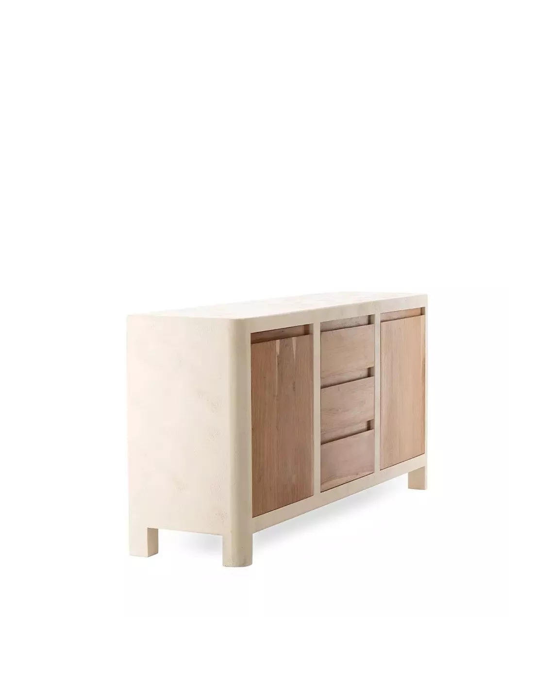 La blancheur de la structure du buffet 2 portes 3 tiroirs Comino évoque les villages typiques où le blanc des murs se mêle aux couleurs éclatantes des bougainvilliers.