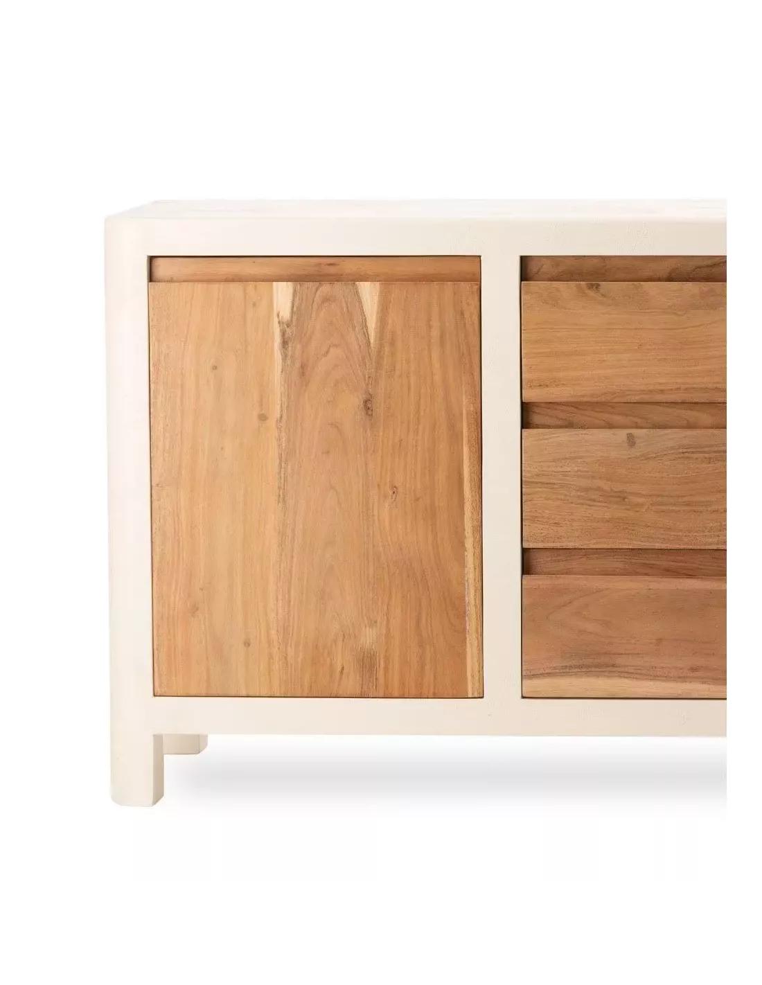Réalisé en contreplaqué enduit de béton, ce buffet allie un design épuré et une finition parfaite. Ses 2 portes et 3 tiroirs sont en bois d’acacia, offrant ainsi des espace de rangement distincts.