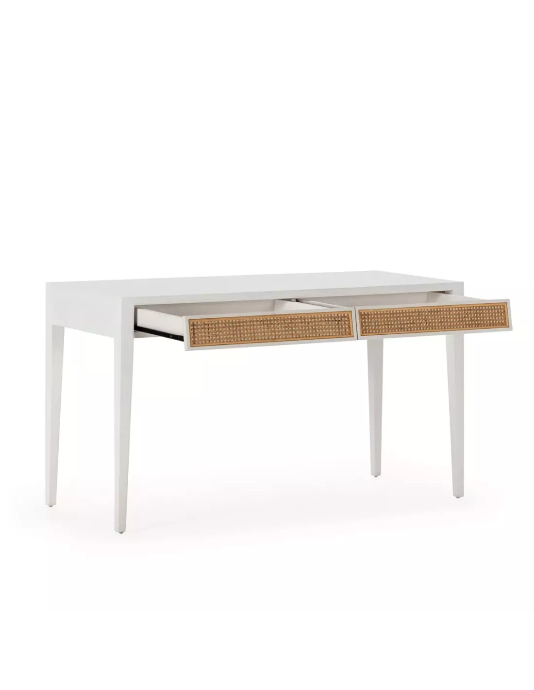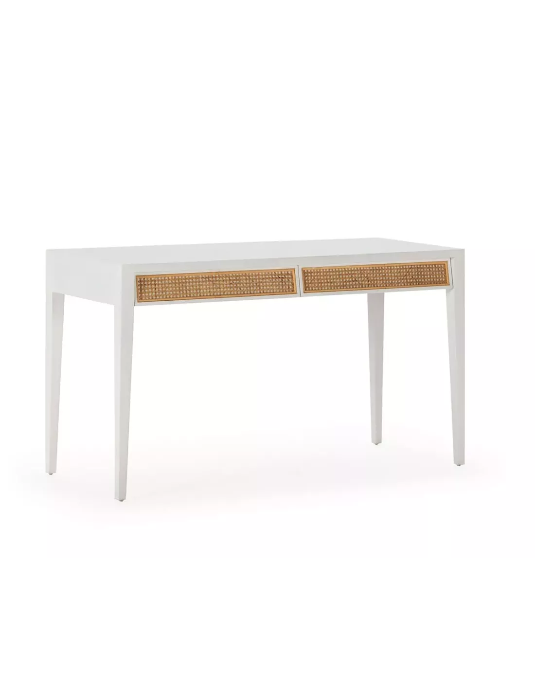 Bureau blanc 2 tiroirs en bois de cèdre et cannage, Thai Natura