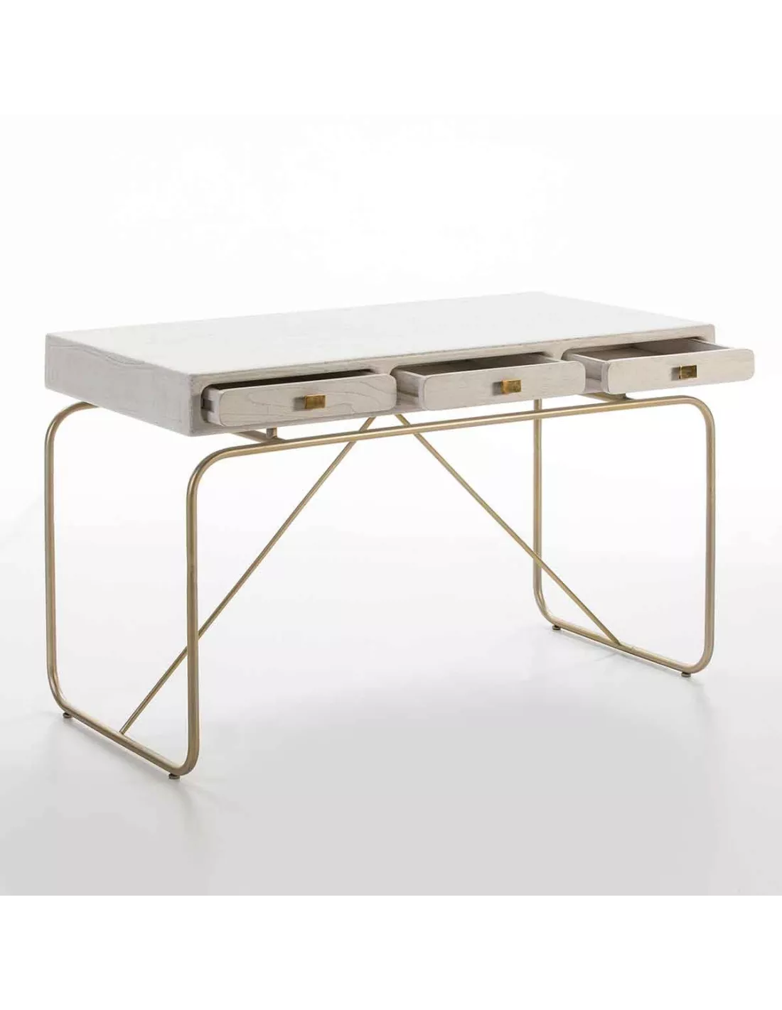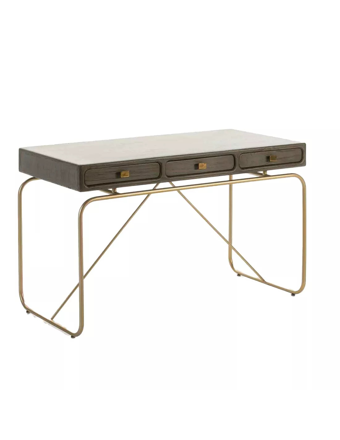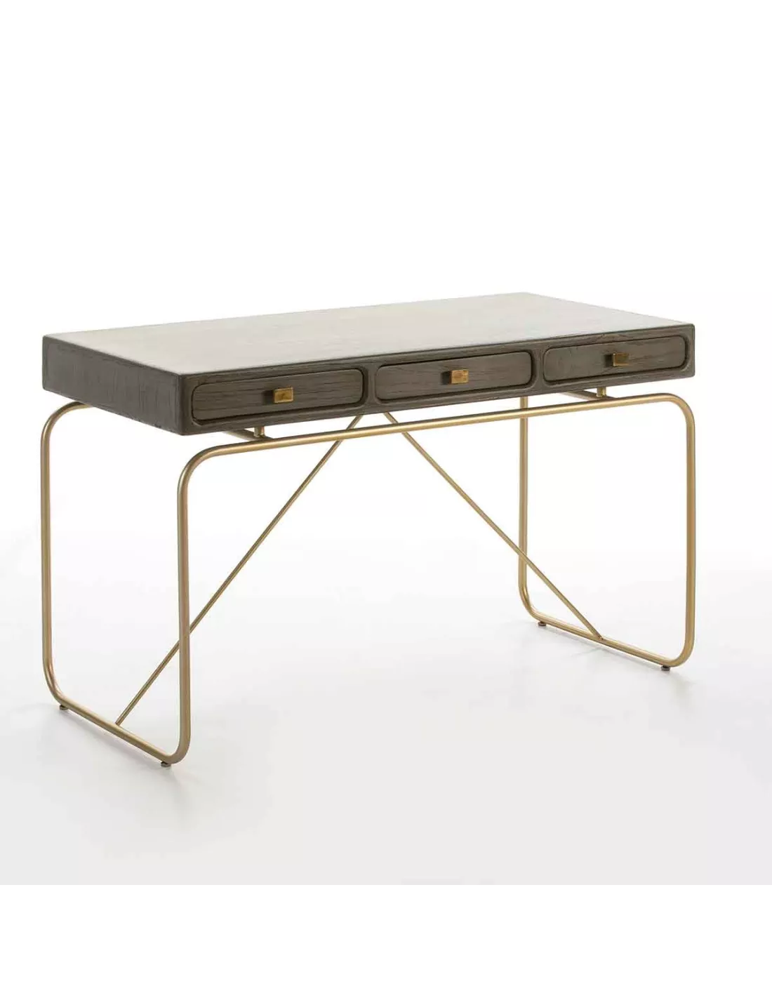 Bureau 3 tiroirs en bois gris et métal doré, Thai Natura