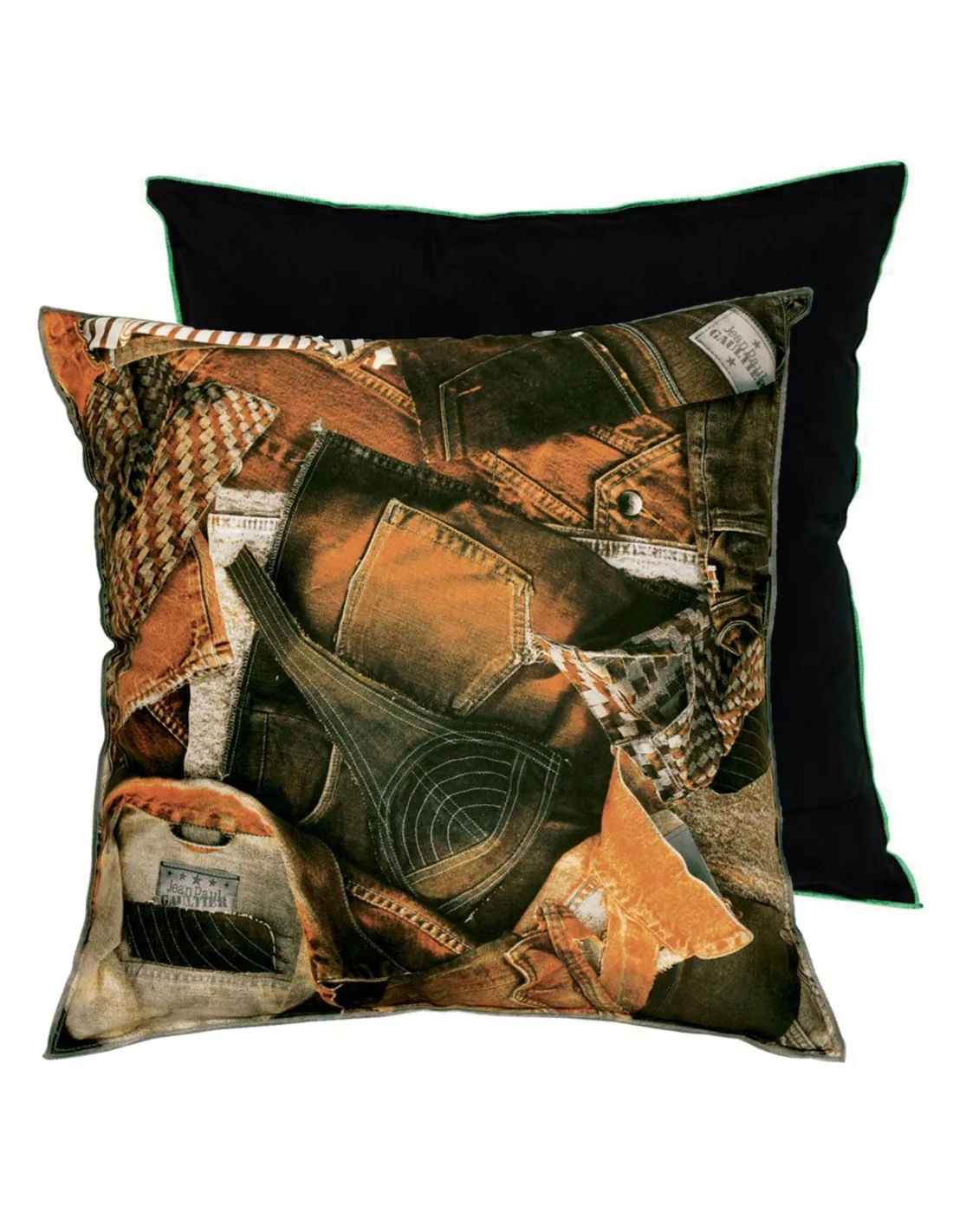 Le coussin America terre by Jean Paul Gaultier siglé dans le coin haut droit.