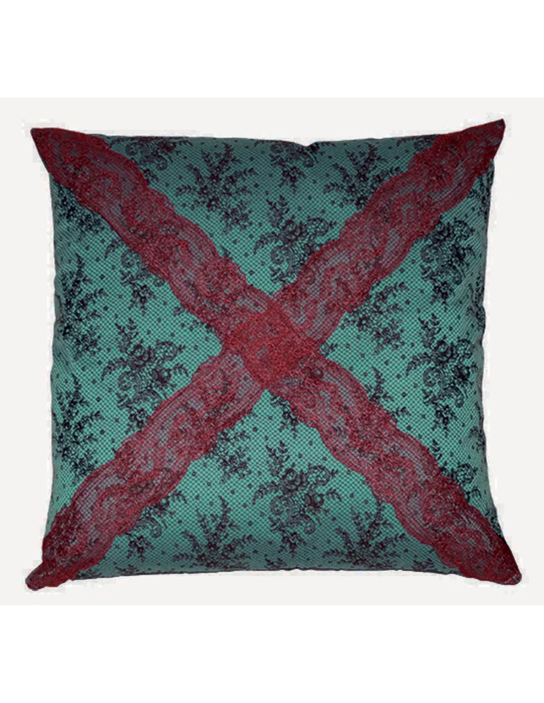 Coussin Féminine graphite pétrole/rouge Jean Paul Gaultier Maison, dont le dos est uni pétrole. Jean Paul Gaultier jongle de façon créative et décalée avec tous les codes ! Sur fond de résille imprimée, ce coussin carré propose une jolie application de dentelle en relief. Coussin, issu de la collection Dentelle, coordonné aux coussins Discret, signature Jean Paul Gaultier.