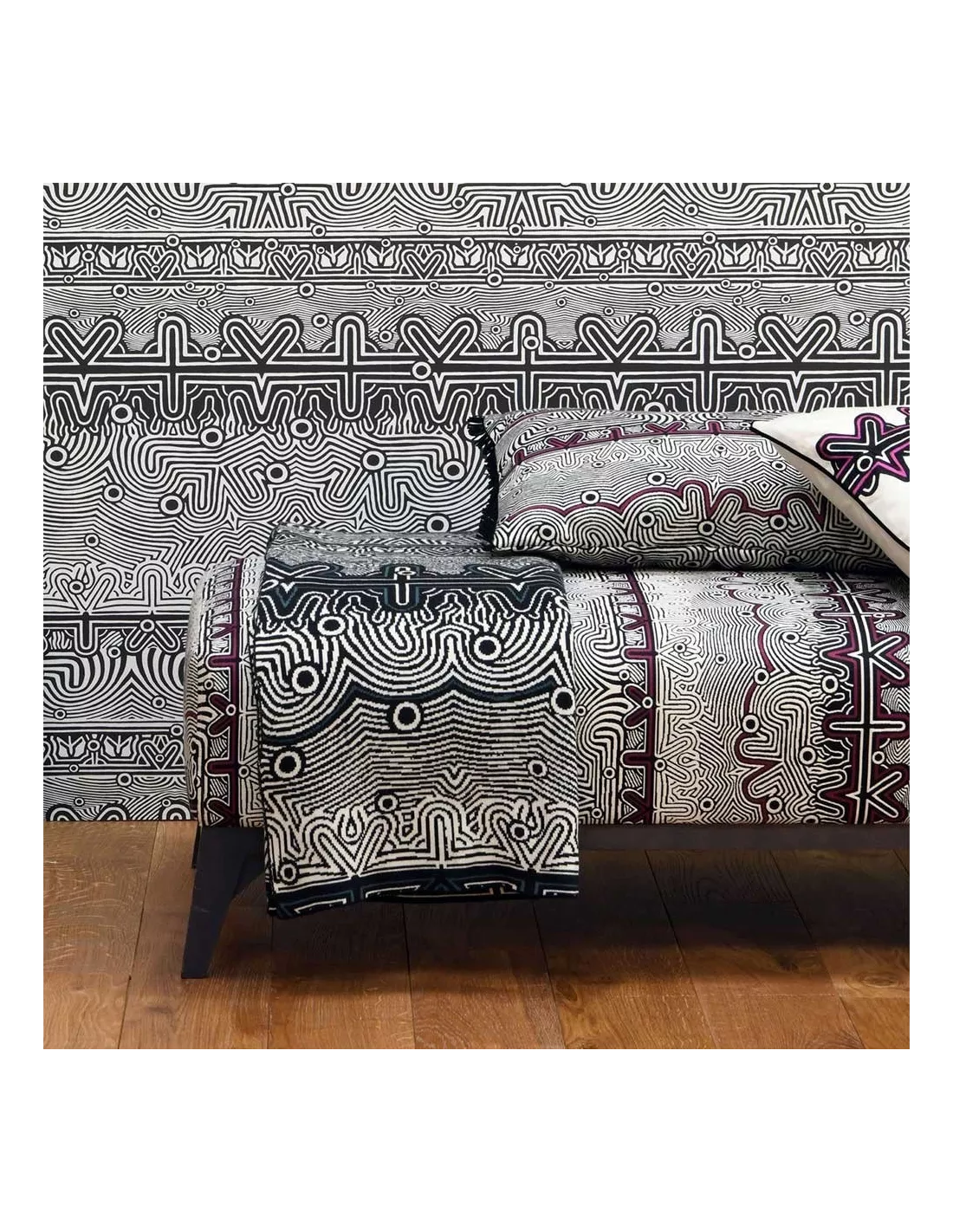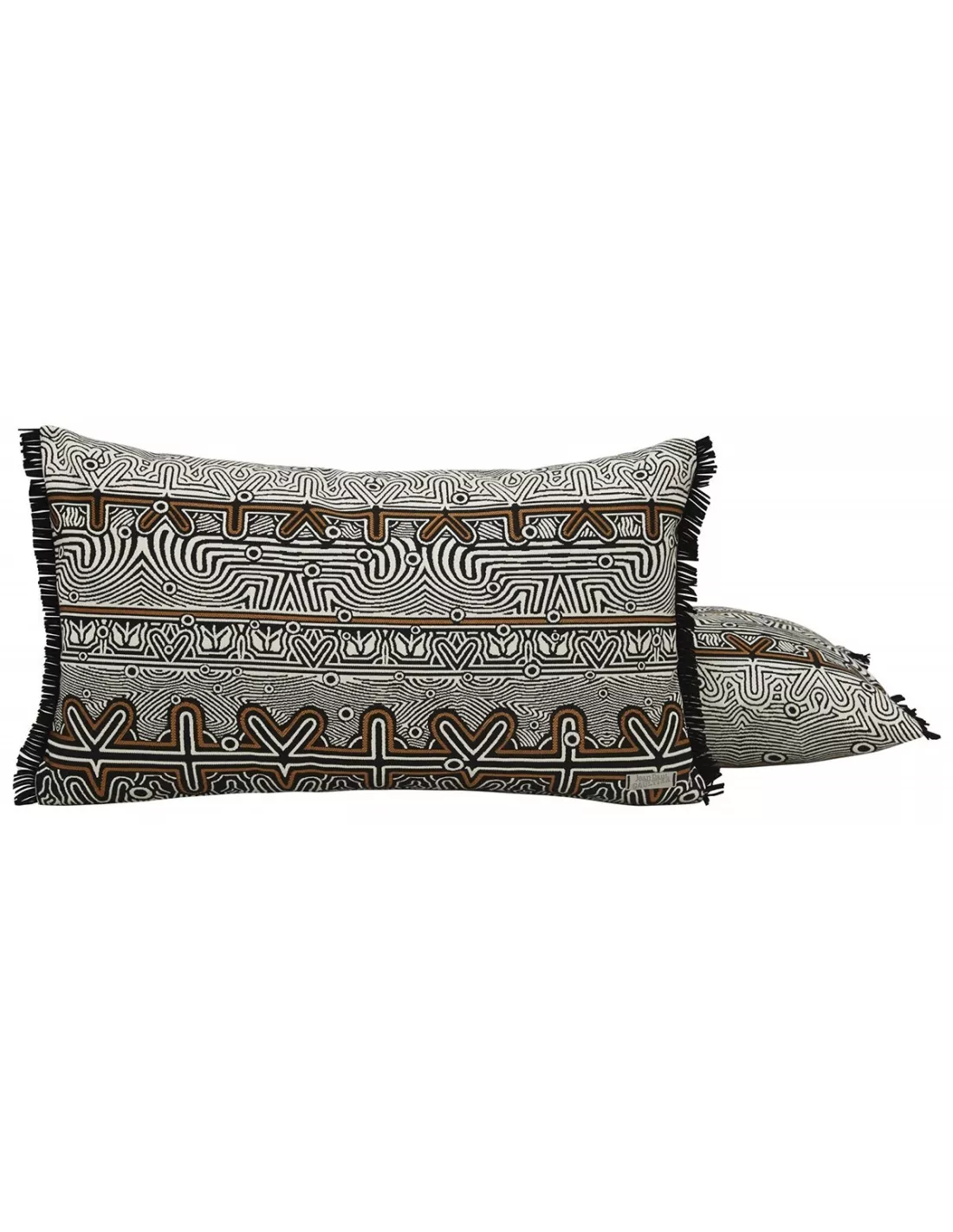 Coussin rectangulaire noir à franges illustrant un labyrinthe, Jean Paul Gaultier