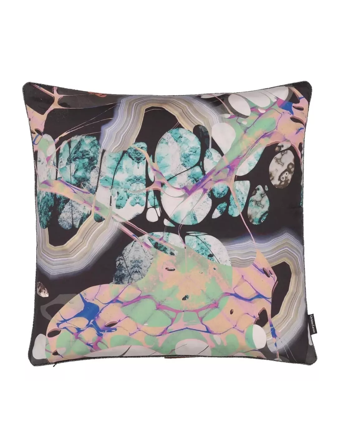 Coussin carré multicolore aux créatures exotiques encadrées par les lettres graphiques Lacroix, Christian Lacroix