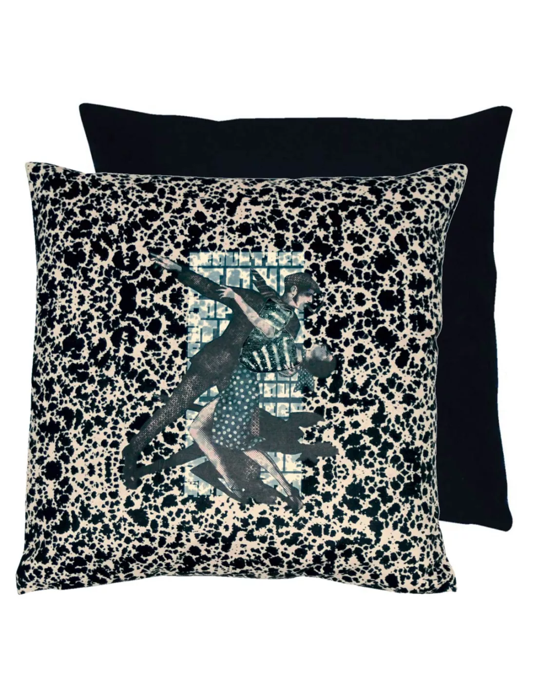 Coussin Tango graphite Jean Paul Gaultier siglé en bas à droite. Un pas de Tango pour ce couple de danseurs, transféré sur le motif du tissu Jean Paul Gaultier ‘Beaux Arts’ ! Le motif central réalisé en transfert brillant contraste sur le support mat. Le coussin Tango exprime un certain esprit de dynamisme et trouvera sa place dans toutes les pièces de la maison.