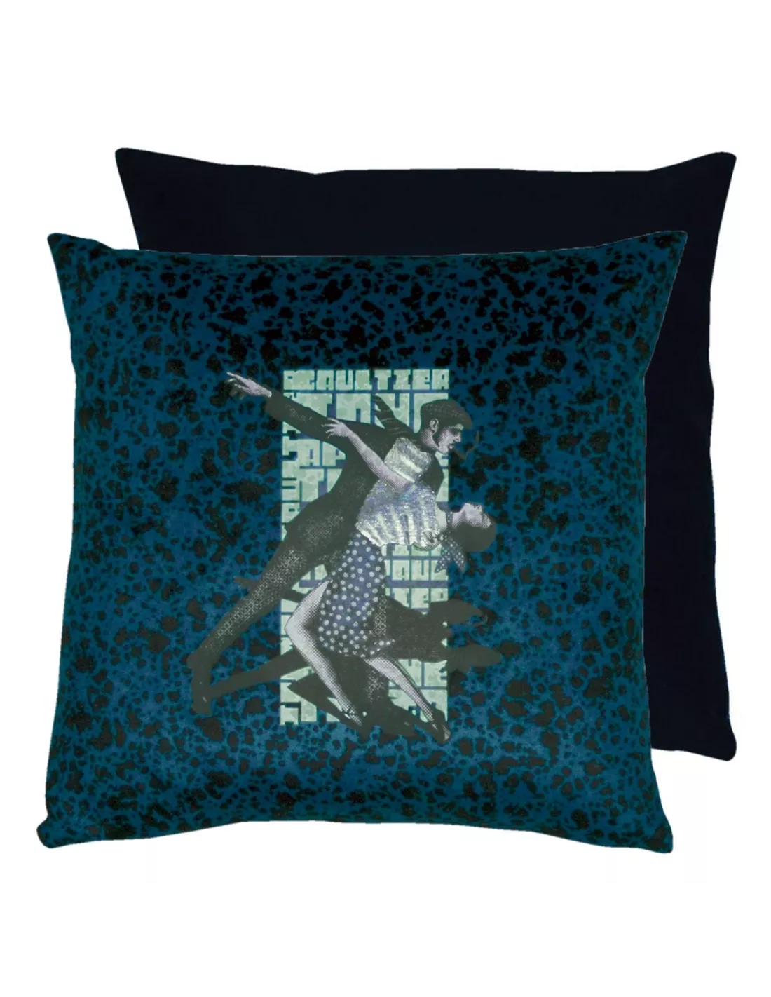 Coussin Tango indigo Jean Paul Gaultier siglé en bas à droite. Un pas de Tango pour ce couple de danseurs, transféré sur le motif du tissu Jean Paul Gaultier ‘Beaux Arts’ ! Le motif central réalisé en transfert brillant contraste sur le support mat. Le coussin Tango exprime un certain esprit de dynamisme et trouvera sa place dans toutes les pièces de la maison.
