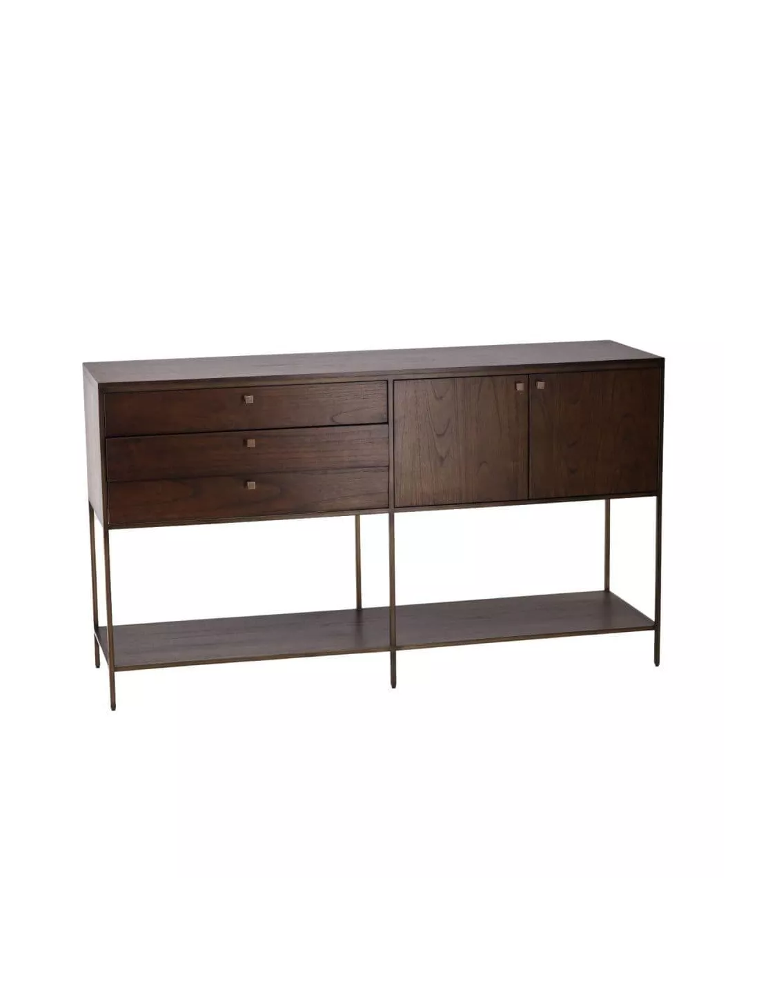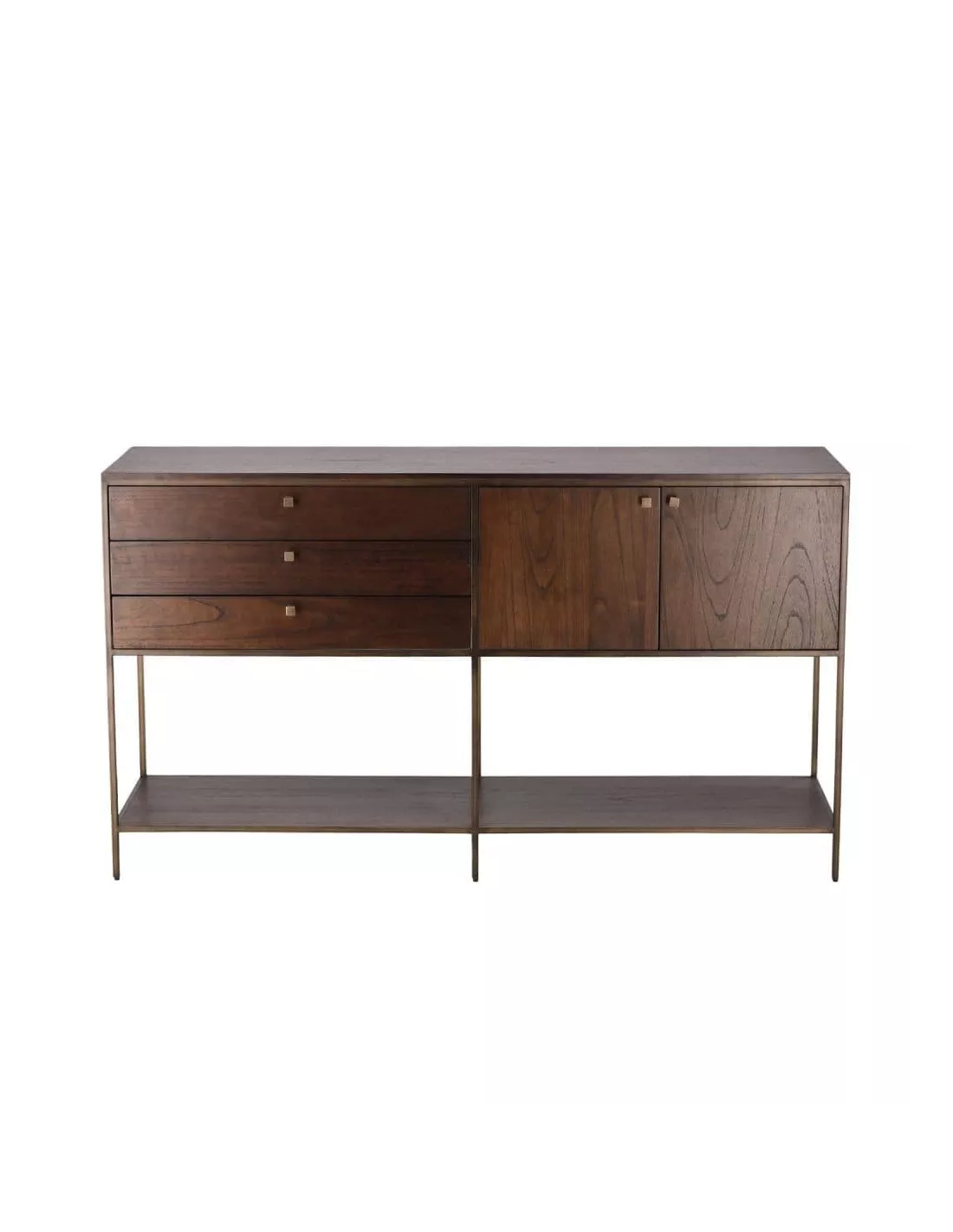 Une particularité de cette enfilade est la partie basse habillée d’un large plateau, qui confère une légèreté au meuble. Cette fonction intelligente ajoute un espace de rangement supplémentaire. Vous pouvez utiliser ce plateau pour exposer des objets décoratifs tels que des vases, des cadres photo ou des sculptures. Il peut également servir de surface pratique pour poser des plateaux de nourriture ou des boissons lors de réceptions ou de dîners.