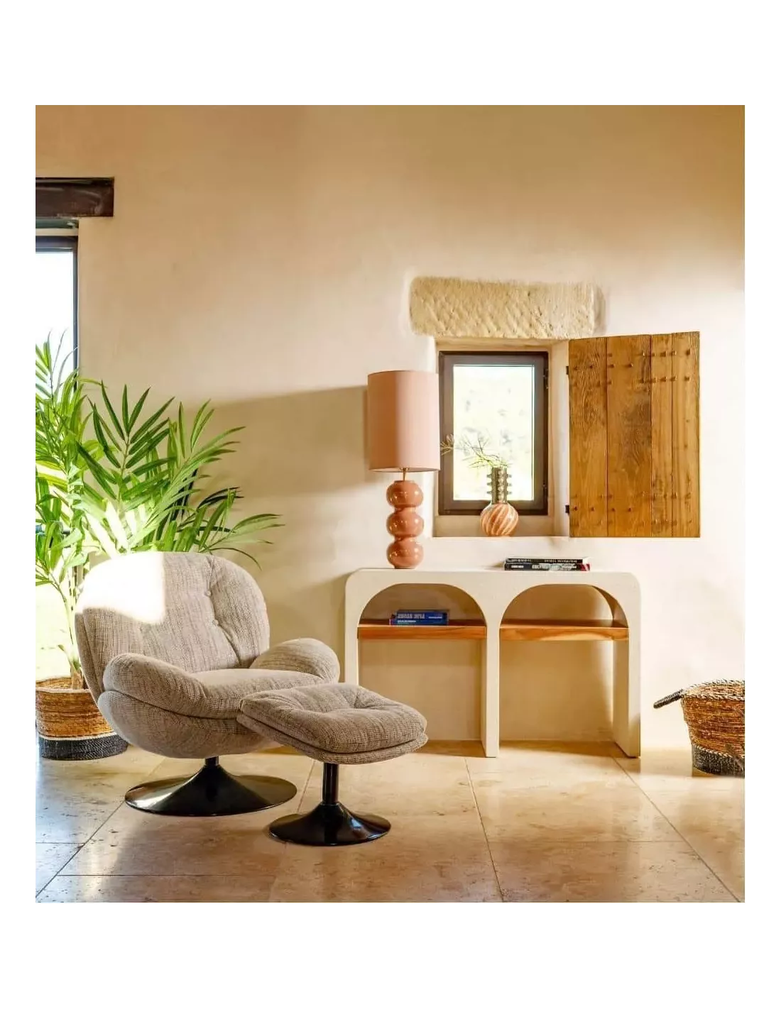 Cet assemblage de formes et de matières crée un effet visuel original et marquant, qui saura trouver sa place aussi bien dans une décoration contemporaine que rétro. Cette lampe terracotta diffuse une lumière douce et tamisée.