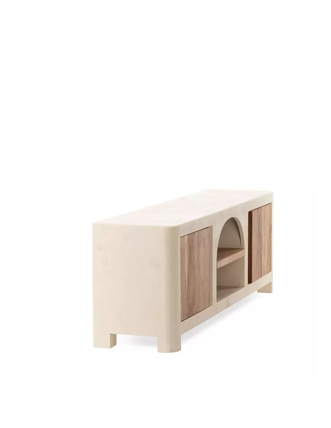 Réalisé en contreplaqué enduit de béton, ce buffet allie un design épuré et une finition parfaite. Ses 2 portes et l’étagère de la niche sont en bois d’acacia.