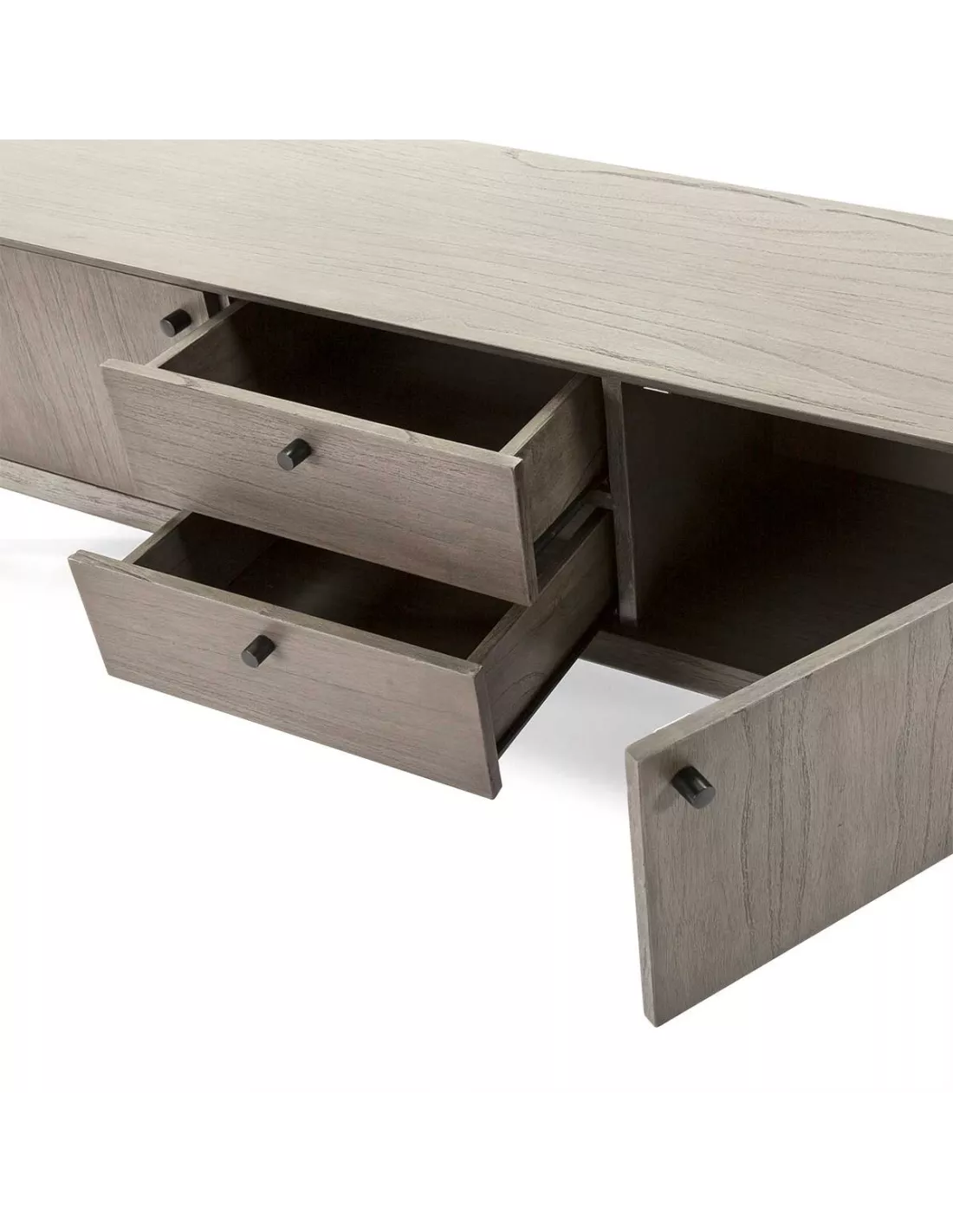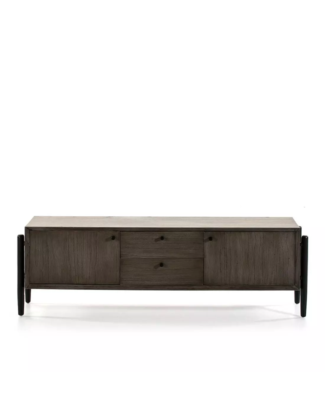 Laissez vous séduire par ce meuble TV Thai Natura en bois gris et noir issus de forêts durables. Ce meuble TV, doté de 2 portes et de 2 tiroirs, se mariera avec tous les styles d’intérieur et donnera une touche raffinée à votre décoration. Ce meuble TV aux poignées en métal noir est fabriqué en Espagne.