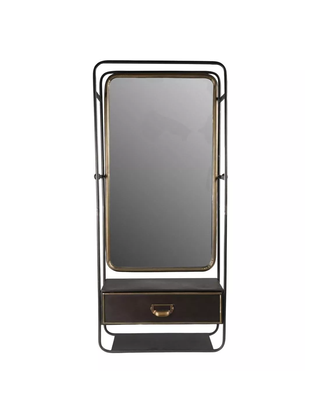 Laissez vous séduire par ce miroir et rangement noir doré à suspendre au mur. Il est réalisé en métal noir et doré foncé. Ses deux accroches murales, vous permettront de la fixer au mur, où bon vous semble ! Ce miroir « rangement » à suspendre vous sera utile pour vous regarder, mais aussi pour y ranger des objets sur son plateau et dans son tiroir. Accroché au mur dans votre salon, chambre, dressing ou couloir, ce miroir très pratique sera également un véritable accessoire de décoration.