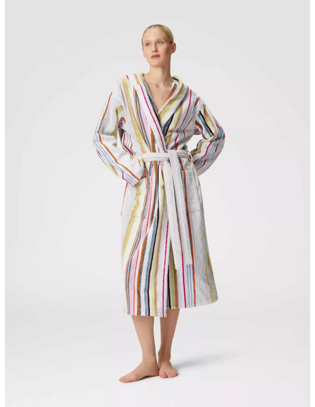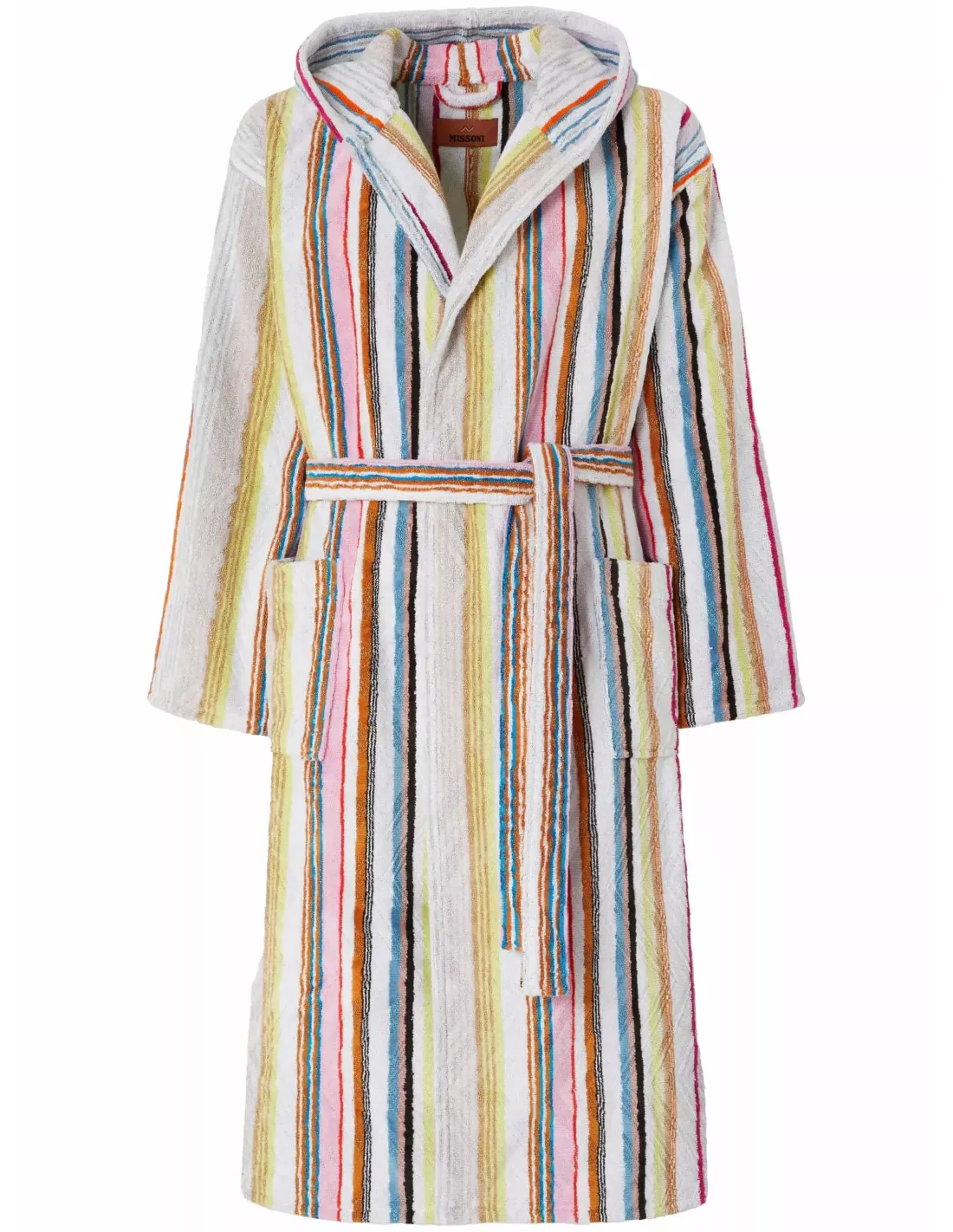 Orné d’un motif raffiné à rayures verticales, le peignoir Moonshadow en coton éponge se distingue par de subtils empiècements en lurex qui lui confèrent un aspect brillant. Les rayures verticales multicolores, agencées en différentes densités, insufflent une dynamique visuelle à l’éponge douce à chevrons. Équipé d’une ceinture, d’une capuche et de poches plaquées, ce peignoir à capuche Missoni est le parfait accessoire pour apporter une touche de glamour à votre quotidien.