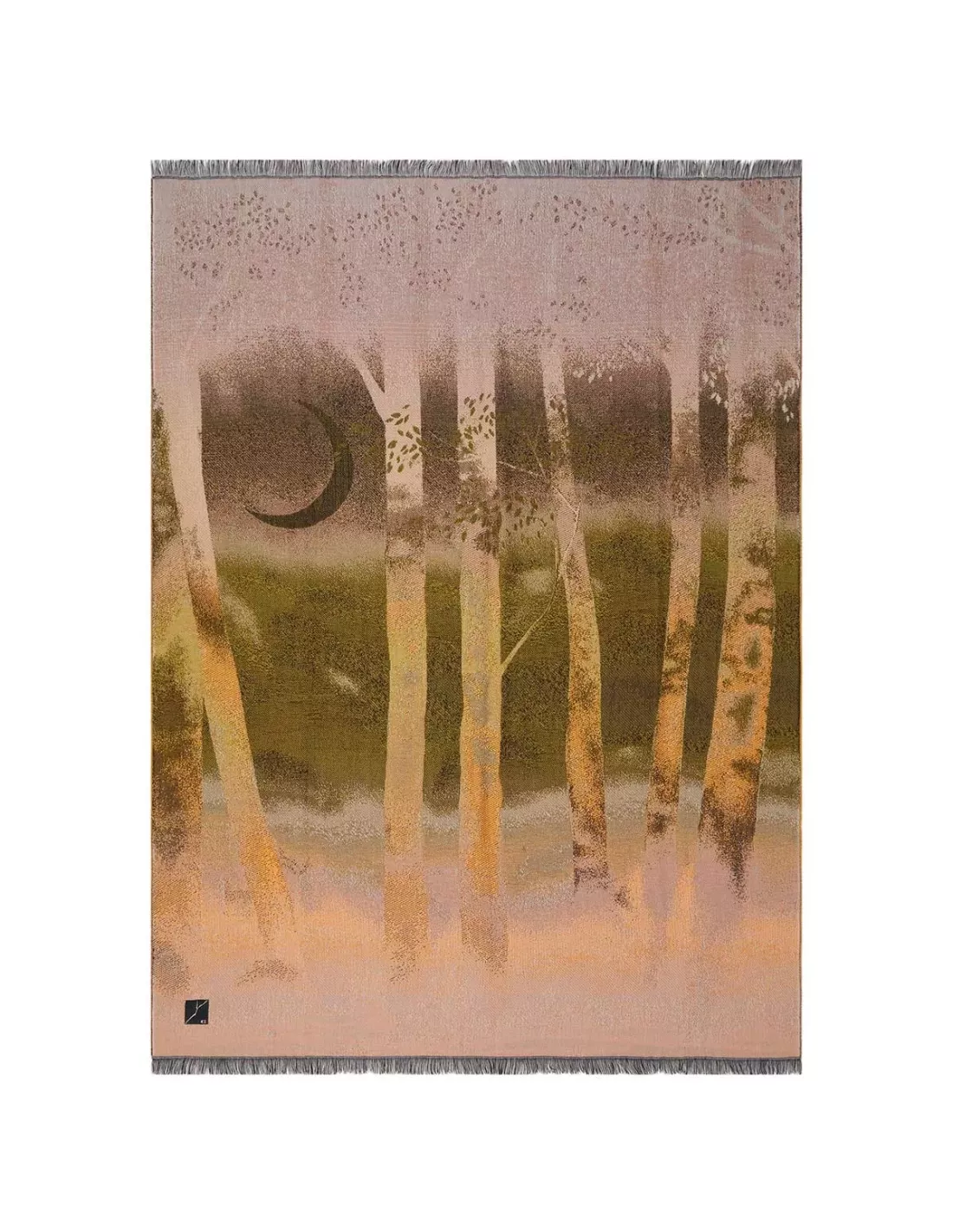 Le plaid Shinlin de K3 Design offre une expérience visuelle envoûtante, avec son paysage forestier captivant. Les troncs élancés des arbres se fondent dans un feuillage opulent, baignés dans la lueur dorée d’un soleil couchant. Tissé en jacquard à partir d’une laine mélangée, ce plaid allie confort et style raffiné. Ses franges sur les côtés apportent une finition élégante.