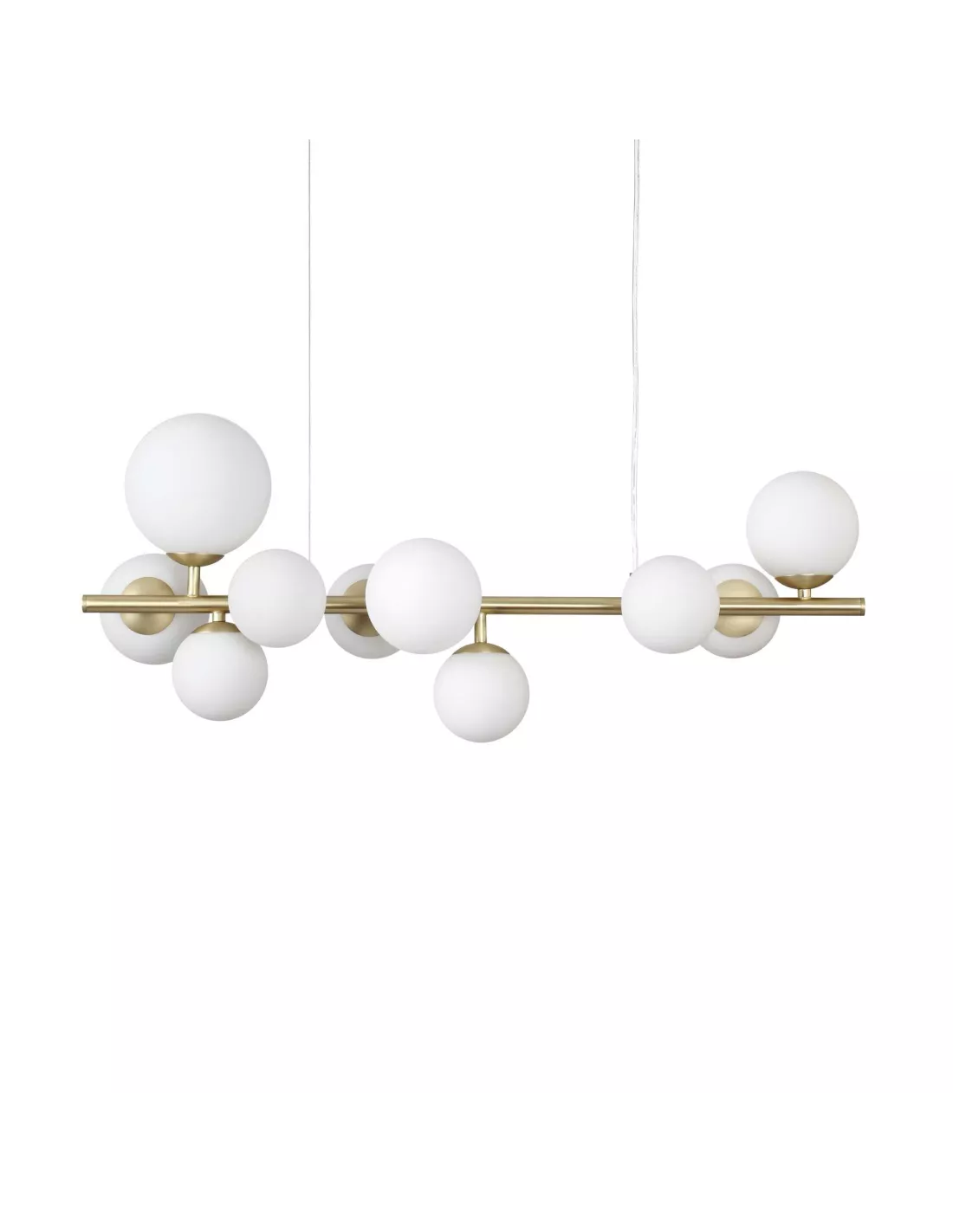 La suspension Perlage dorée arbore un look résolument design. Cette suspension design fournit non seulement un éclairage sans éblouissement, mais également un éclairage uniforme de la pièce. La structure est réalisée en métal doré satiné et les 10 diffuseurs sont en verre soufflé.