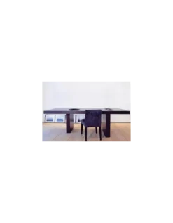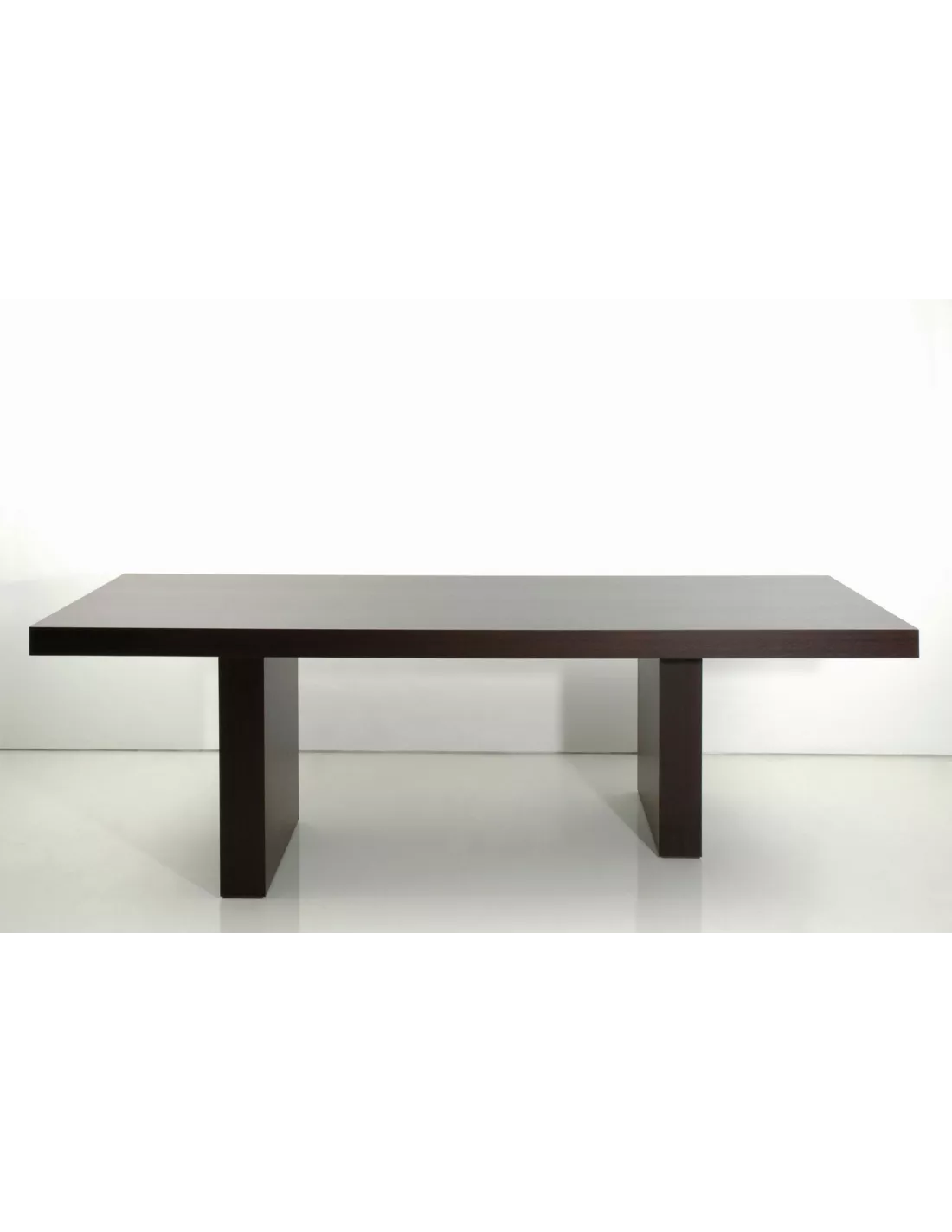 Cette table de salle à manger rectangulaire, en très beau placage (8mm) de palissandre teinté ébène ou de chêne clair, possède un raffinement supplémentaire : les deux piètements verticaux, épais et sobres, sont décentrés.