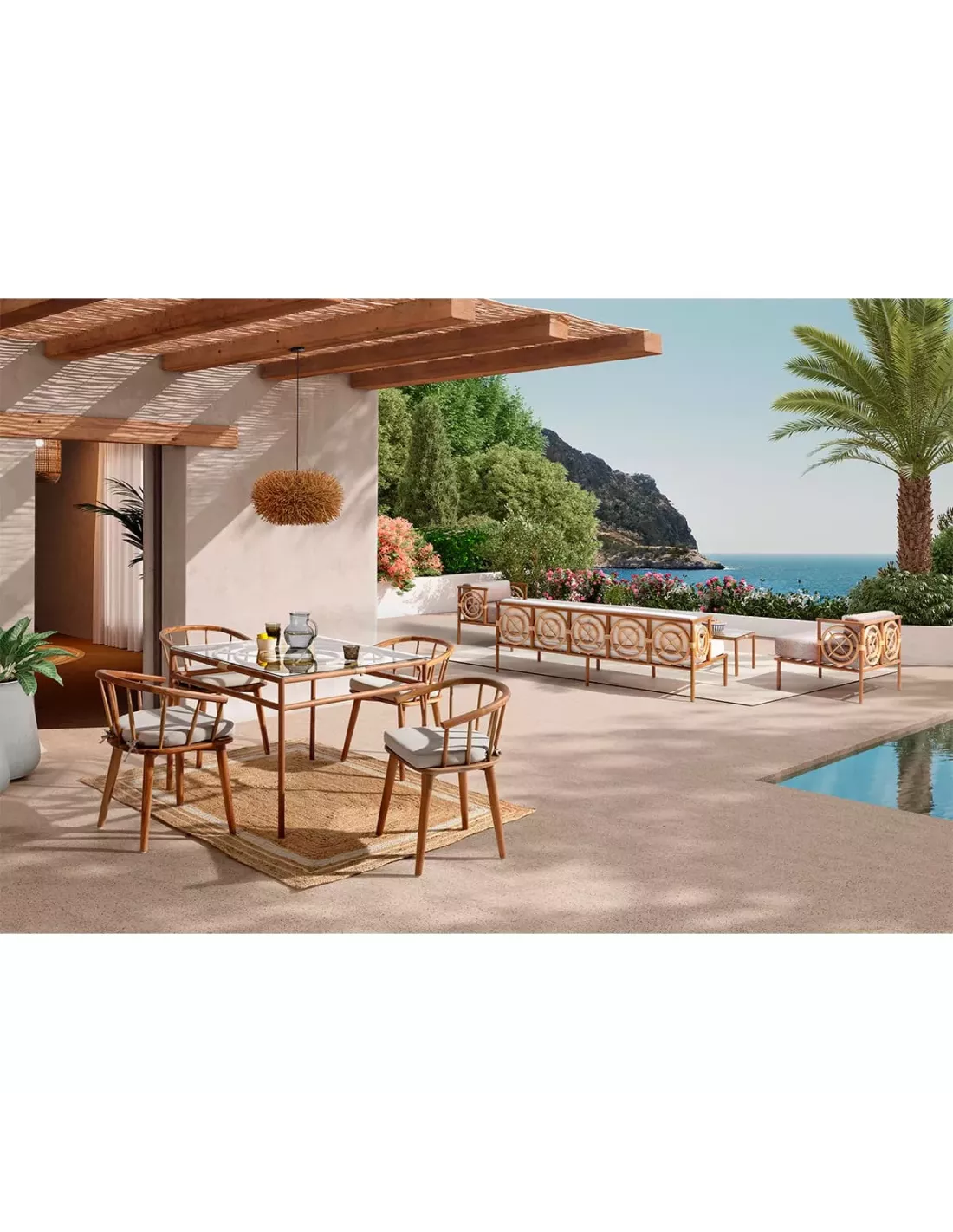 Cette table de repas extérieure Thai Natura allie avec harmonie les différents matériaux nobles qui le composent. Le teck, le rotin et le verre se marient parfaitement pour donner vie à un mobilier d’extérieur à la fois élégant et très fonctionnel.