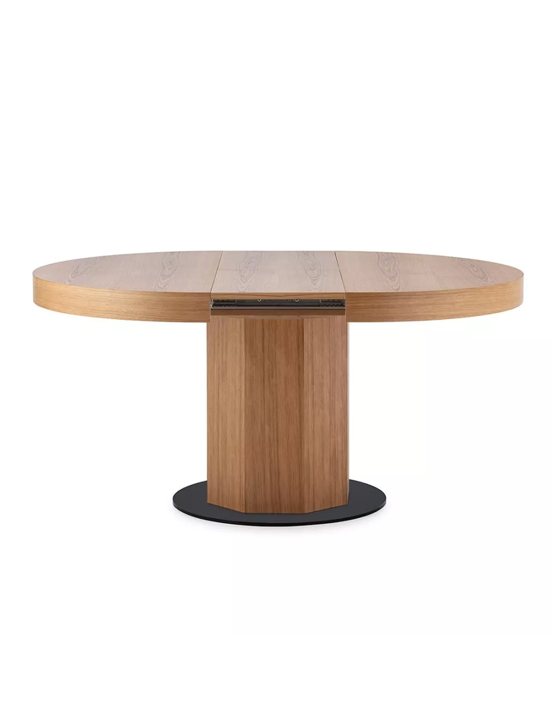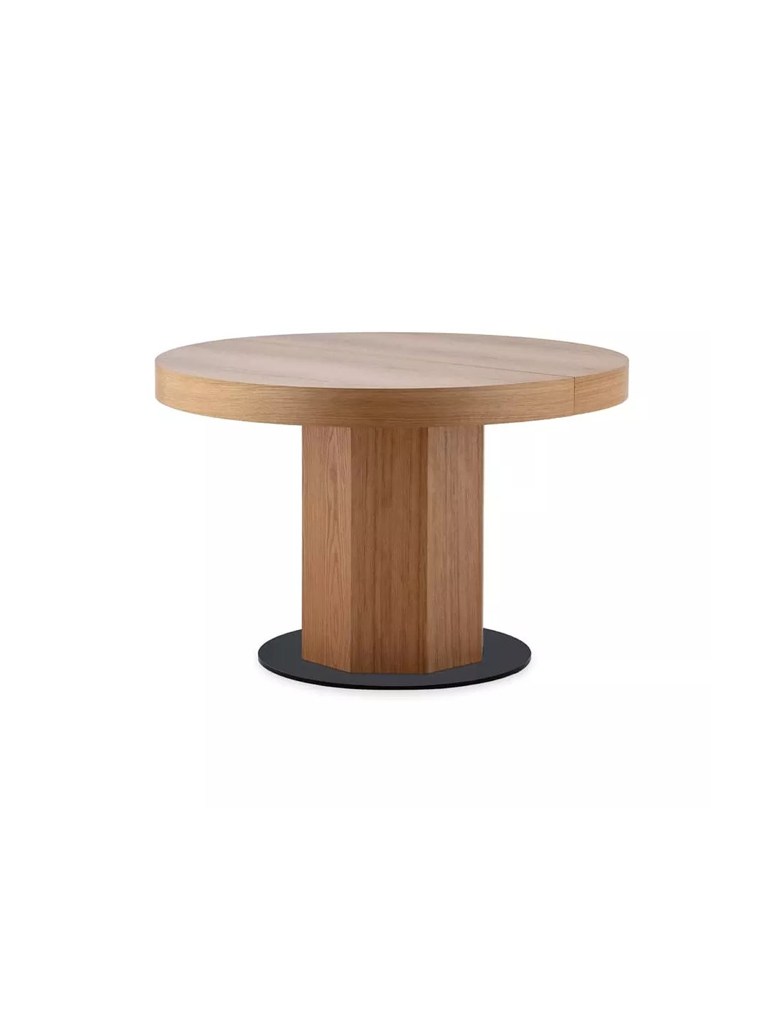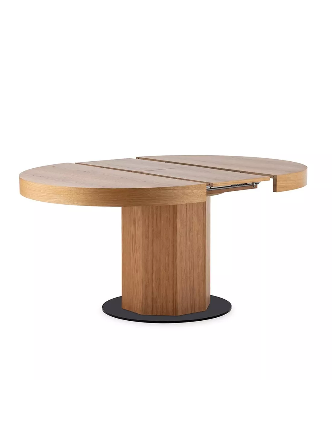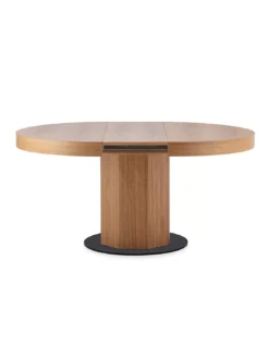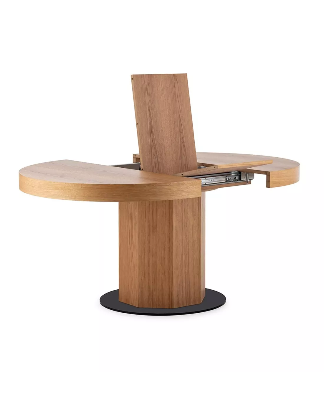 Très tendance, la table ronde à rallonge Marla donnera une touche déco et extrêmement élégante à votre décoration intérieure. Cette très belle table est réalisée en bois de chêne de très belle facture. Nous aimons tout particulièrement son piètement raffiné à la forme hexagonale qui repose sur un cercle de métal noir. L’ensemble dégage une grande élégance.