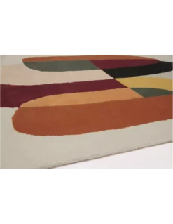 Tapis design fond beige aux motifs jaune, orange, bordeaux et vert , Edito