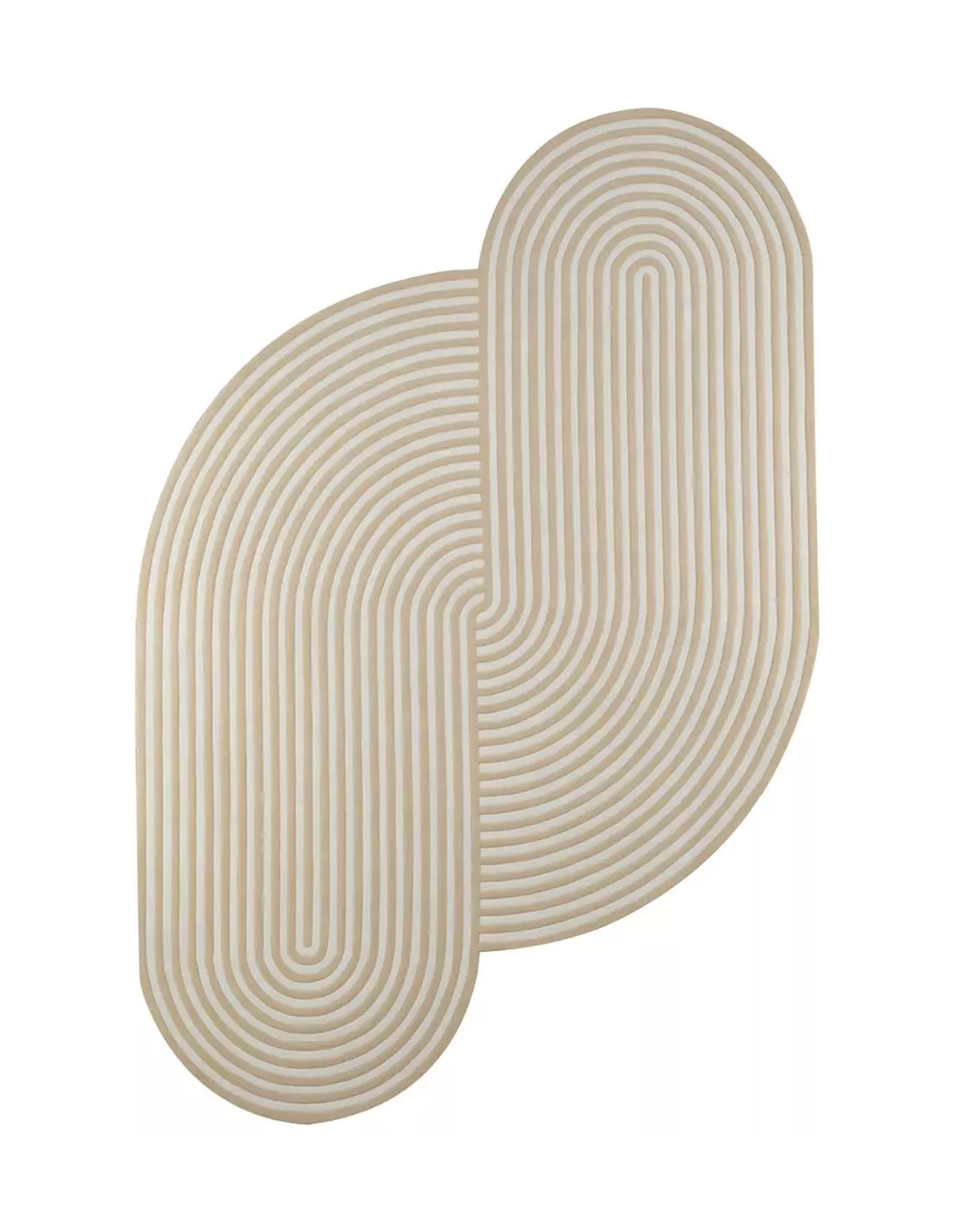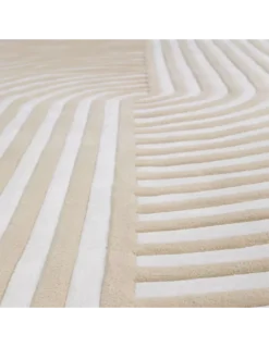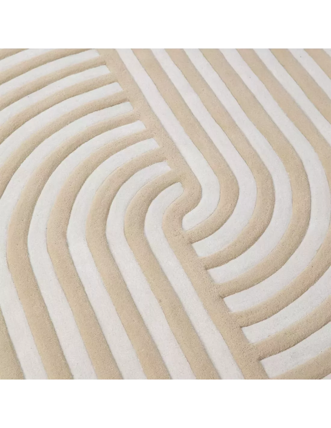 D’une dimension généreuse de 253 x 368 cm et d’une épaisseur de 1,2 cm, ce tapis tufté main, coupé et ciselé offre une hauteur de poils allant de 8 à 12 mm pour un confort optimal. Ses ondulations élégantes et graphiques s’inspirent des jardins japonais contemporains, rappelant les sillons tracés dans un parterre de graviers.