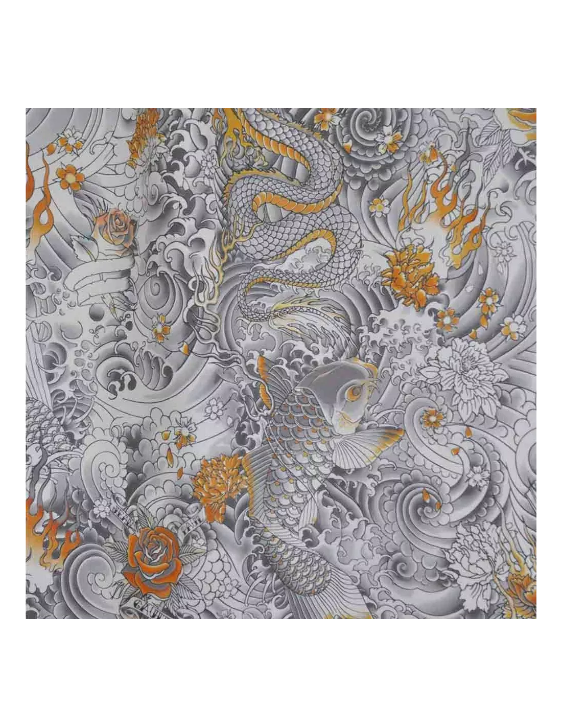 Le tissu Rock Gold Jean Paul Gaultier est une belle toile de coton et lin souple et fluide, imprimée d’un motif de tatouage tout en nuances. Deux colorations, l’une forte et réaliste en indigo et encre, l’autre totalement réinterprétée en neutre, sable et orangé. Ce tissu d’ameublement est lavable à 30°.